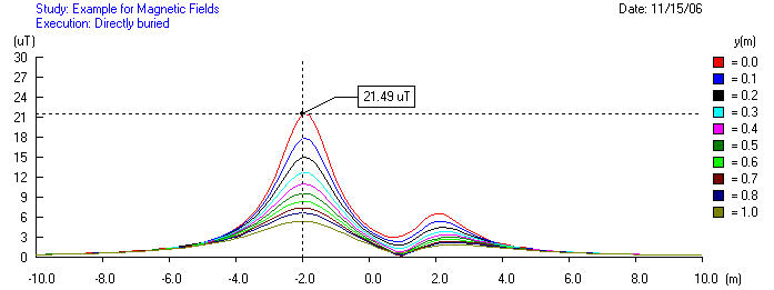 After simulation of a steady state current carrying capacity or temperature, the module calculates the magnetic flux density that an underground cable installation will create at any point towards the ground.